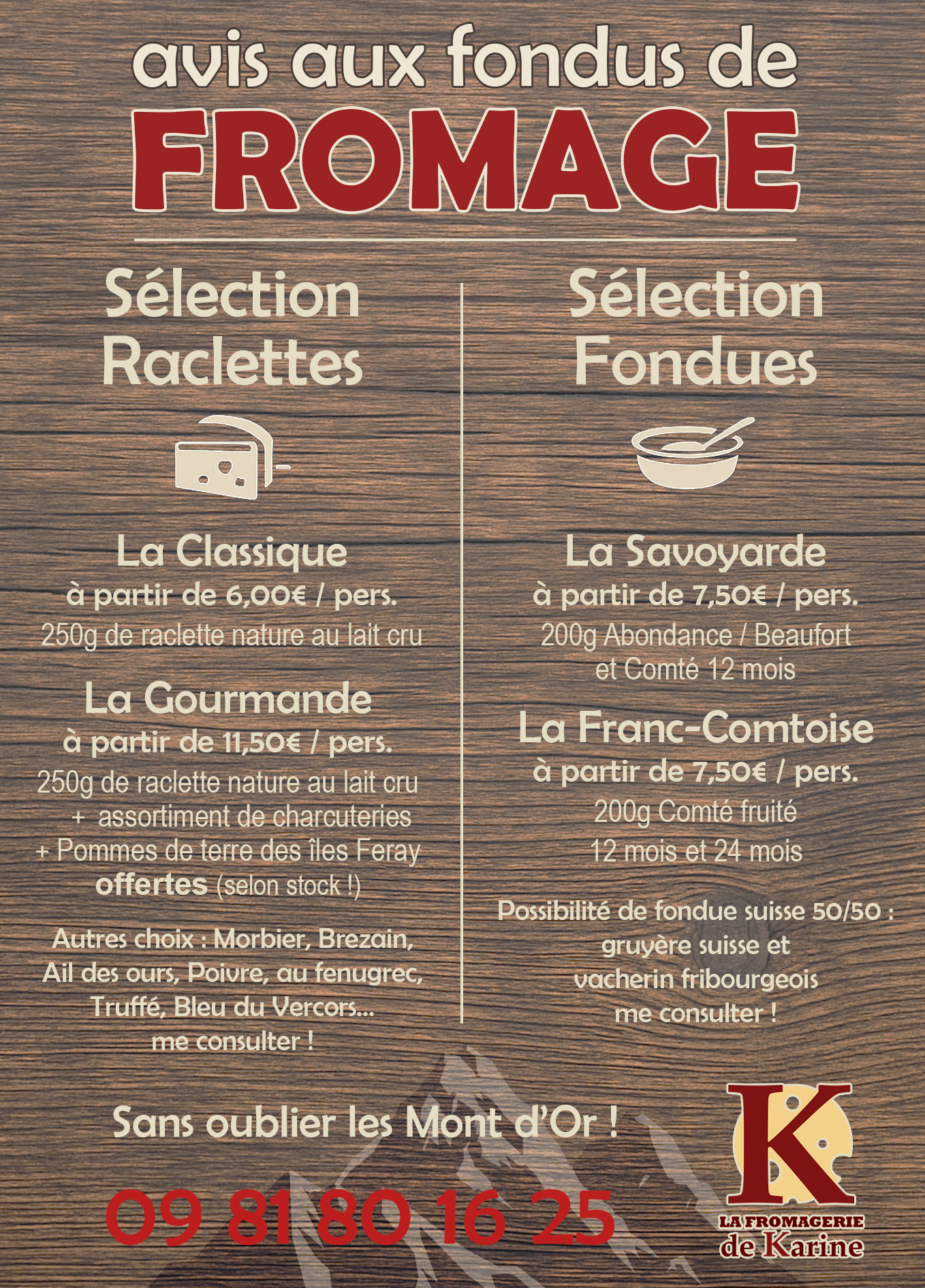 Un large choix de raclette au lait cru:nature,ail des ours,morbier,truffée,forestiere,poivre,fenugrec..
